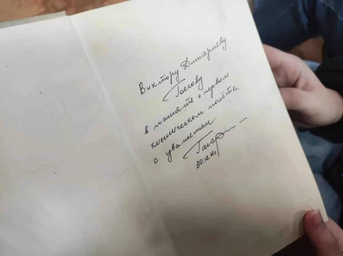Марина Константиновна показала эту уникальную книгу зрителям. На титульной странице рукой Гагарина написано: «Виктору Дмитриевичу Бесову в память о первом космическом полёте. С уважением, Гагарин. 30.04.61 г.» 🖋️