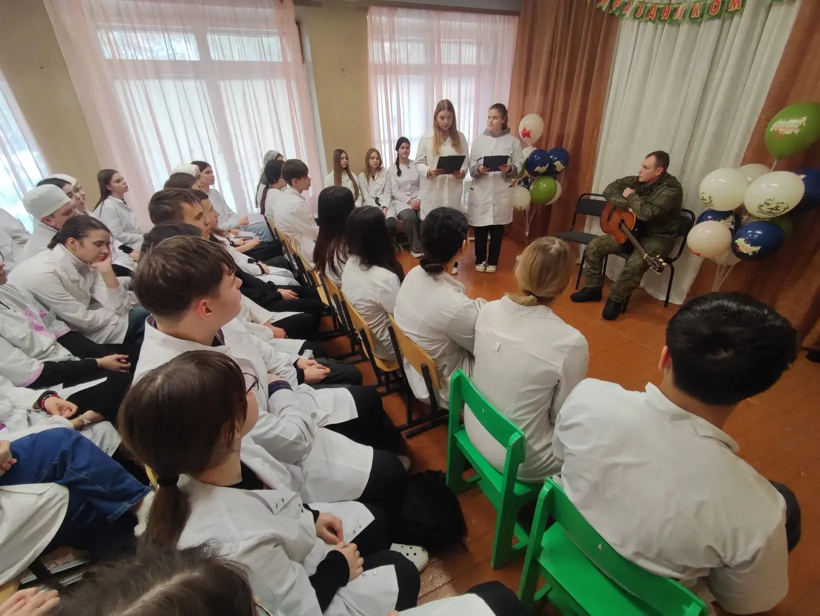 🤓Александр исполнил несколько песен. А затем студент группы 019- С Бузанов Даниил подыграл гостю на своей гитаре, вместе они исполнили песни "Демобилизация", " Группа крови". Весь зал подпевал!